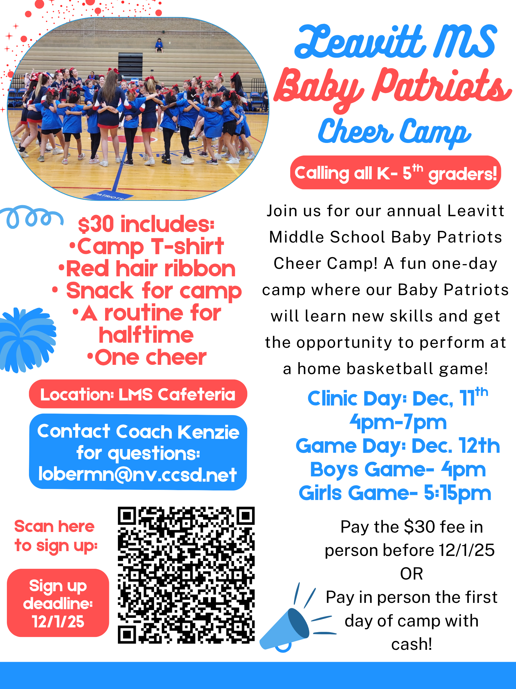 Calling all K-5th graders for our annual LMS Baby Patriots Cheer Camp! Clinic is 12/11 4pm-7pm, game day performance is 12/12. Click for full details!