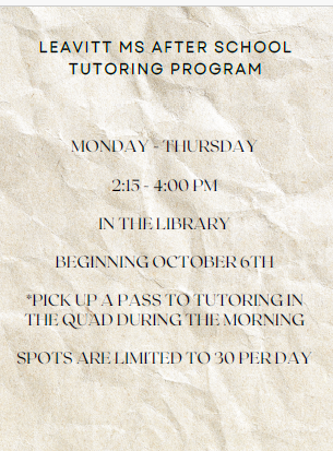 After school tutoring begins 10/6 and is offered Monday - Thursday 2:15 - 4pm. Click for more info!