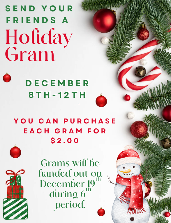 Send your friends a holiday gram. Purchase for $2 from 12/8 - 12/12. Holiday gram delivery will be 12/19 during 6th period. Click for info.