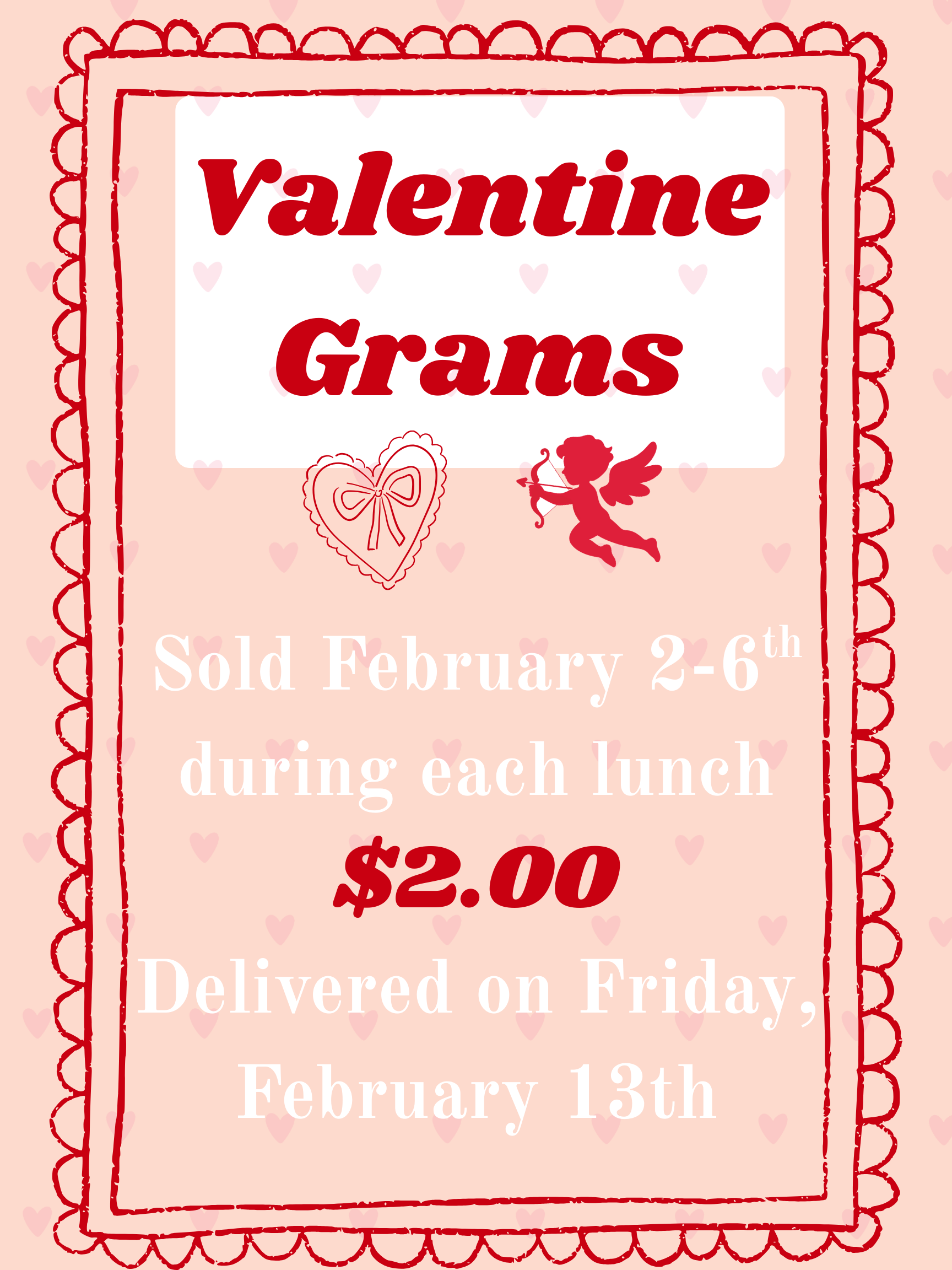 Valentine's Grams Purchase your Valentine's grams from 2/2 - 2/6 during lunches for $2 to be delivered 2/13/2026. Click for more details