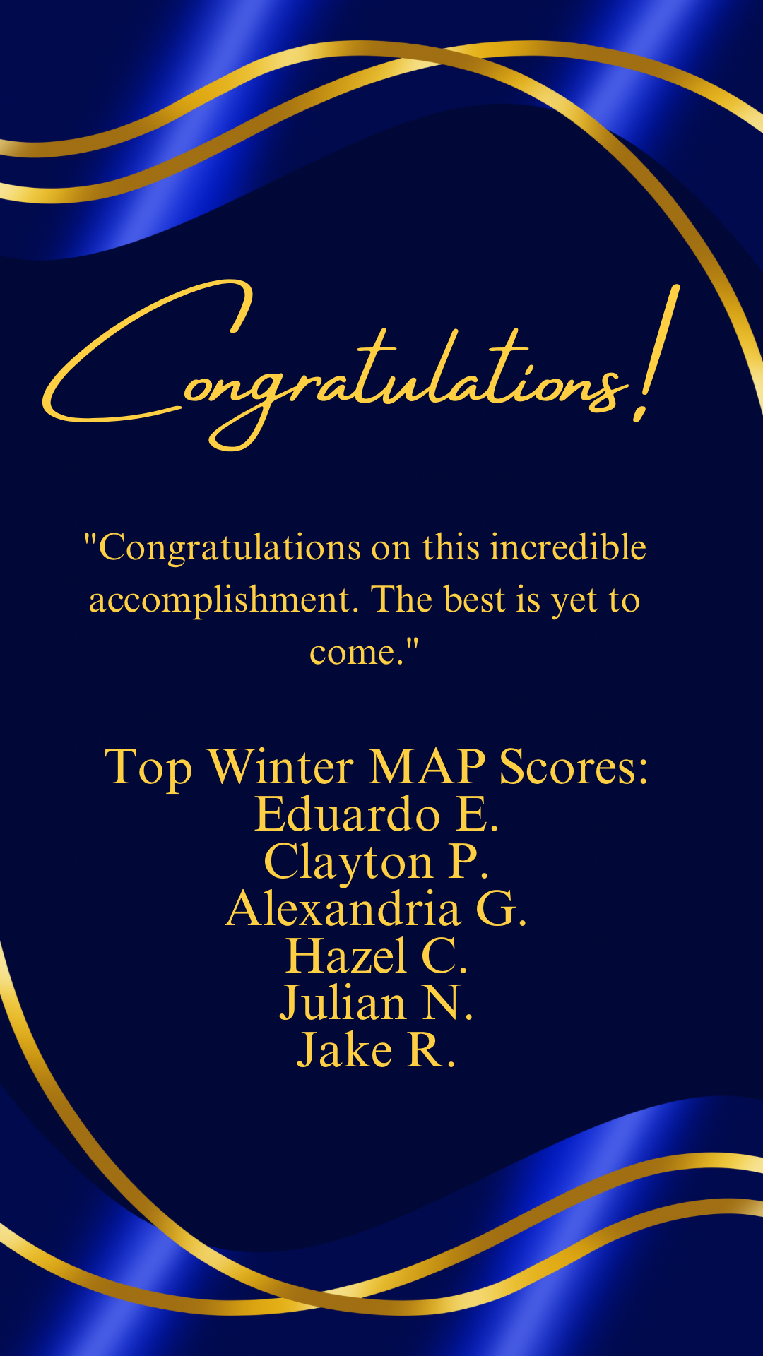 Top Winter MAP Testing Scores Congratulations to our Winter MAP Testing top Scorers. Click to see our students with the top scores.